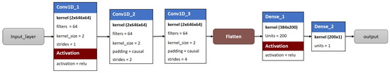 The second proposed model, named spatio-temporal convolutional neural network version 2 (ST_CNN_v2), uses learning structures specific to CNNs and can capture long-range dependencies within the input time series through configurations of filters and layer strides. The model architecture is defined in Figure 4.