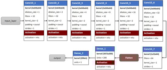 The model features the architecture shown in Figure 5. It starts with the input layer. Six one-dimensional convolutional layers with different expansion factors follow it. The dilation factors range from 1 to 32. This set of dilated layers allows the model to capture time dependencies on more than one scale of input data (time series). The model continues with a one-dimensional convolutional layer with 64 filters, followed by a flattening layer and two densely connected layers with the ReLU activation function. The last dense layer produces a single output, which represents the solar radiation to be predicted. MAE and Adam were used as the loss function and optimizer for model training.