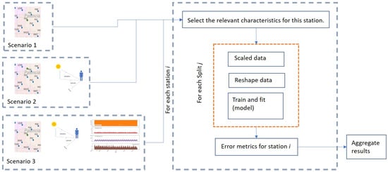 The methodology used is shown in Figure 6. Specific features tailored to each station’s particular scenario were chosen. The data for each fold of the dataset were then scaled and reshaped to prepare it for model training and fitting. Once the data were prepared, the model was trained and fitted. Error metrics were then calculated to assess model performance for each station. Finally, the results of these error metrics were combined to obtain an overall picture of the model performance for all selected stations.