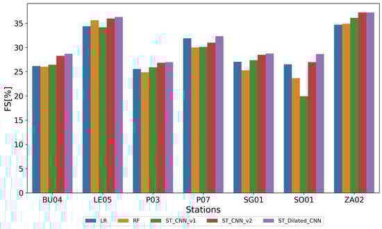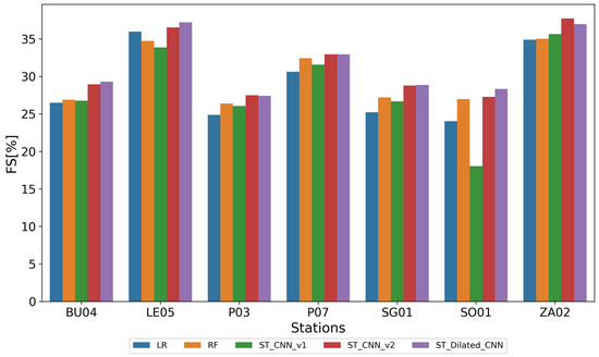 Figure 7 presents a plot of the FS values achieved by the trained models for each of the stations studied. The models are shown in the following order: LR, RF, ST_CNN_v1, ST_CNN_v2, ST_Dilated_CNN.
