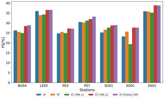 In this scenario, it can be observed that the ST_CNN_v2 model improves the FS results of the ST_Dilated_CNN model for station ZA02, while the ST_Dilated_CNN model outperforms it for the rest of the stations. In Figure 8, it can also be appreciated that stations LE05 and ZA02 are the stations with the highest FS for all models, with a difference of up to 5 points with respect to the rest of the stations. Stations BU04, P03, P07, and SG01 have similar results, with the ST_CNN_v2 and the ST_Dilated_CNN models always exceeding the baseline. The atypical case is station SO01, with the lowest FS values for all models.