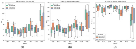 Boxplots of the performance metrics achieved by the proposed models when grouped by the scenarios considered in terms of (a) MAE, (b) RMSE, and (c) R2 score values computed.