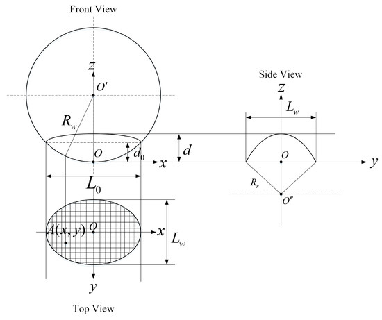 According to the mechanism of wheel flat formation, a localized region of the wheel tread is worn away during sliding. Compared with a complete wheel, a wheel with a flat loses a three-dimensional patch. Empirically, the projection of a wheel flat on the tread surface is approximated as an ellipse, with the long axis of the ellipse parallel to the rolling direction and the short axis parallel to the lateral direction. Therefore, the three-dimensional patch corresponding to the newly formed wheel flat should resemble a semi-ellipsoidal crown, which changes shape with increasing abrasion.