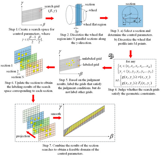 The wheel flat region is discretized into 50 parallel sections along the lateral direction of the wheel tread. Within each section, the wheel flat profile is further discretized into 50 points. is defined for each specific value of , where . Therefore, the feasible domain search space corresponding to each section is subdivided into a 20 × 20 grid based on the control parameters. Each grid cell corresponds to a specific combination of the control parameters, denoted as and . Subsequently, each grid cell is systematically evaluated to determine if all discretized points within the current section satisfy Equation (13) within the numerical computation tolerance. This evaluation process is translated into solving a convex optimization problem. If all points in a grid cell meet the criteria of Equation (13), the cell is marked as valid; otherwise, it is marked as invalid. Finally, the intersection of all valid grid cells across sections defines the distribution of labeled cells, and the boundary of the feasible domain is refined using nearest neighbor interpolation.