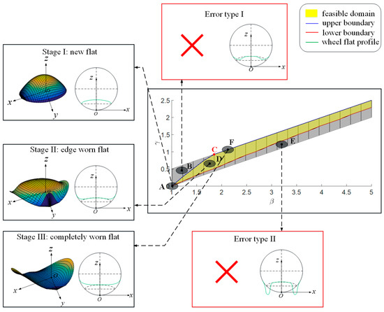 In the feasible domain, point A corresponds to the control parameter ,, indicating that the length of the worn region of the wheel flat is 0, representing the new flat stage. As the wheel flat undergoes edge wear, the length of the flat increases, at which time the value of increases, and the range of expands accordingly. When (), it reaches for the first time and maintains this relationship thereafter. Therefore, point C marks the critical transition between the edge-worn stage and the completely worn stage. Subsequently, at Point D, and correspond to Stage II, and at Point F, and correspond to Stage III.