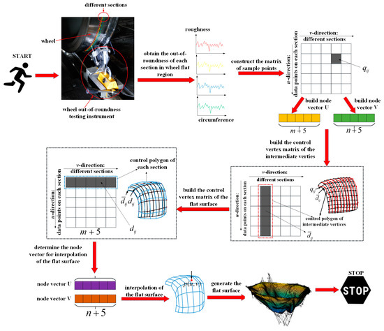 In recent years, the non-uniform rational B-splines (NURBS) method has gained popularity as a mathematical description of shapes in computer-aided geometric design (CAGD). This method combines the advantages of Bézier’s method and offers great flexibility in designing complex surfaces such as wheel flats. In the design of profiles of wheel and rail, and wear prediction, the cubic B-spline is primarily used [22,23,24,25,26,27]. In addition, the B-spline technique plays an important role in the profile design of high-speed turnout switch panels [28]. This paper focuses on establishing the complex surface reconstruction algorithm of wheel flats based on the cubic B-spline.
