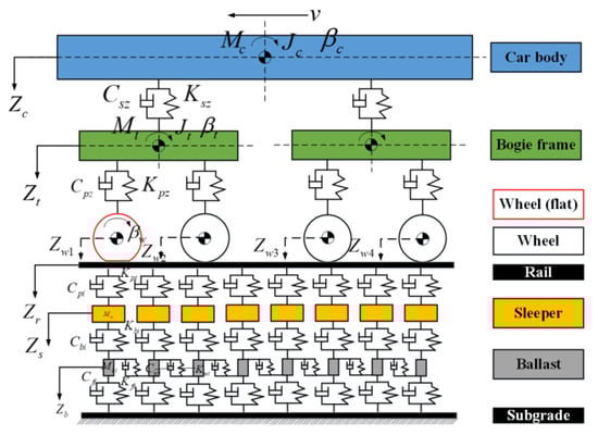 Uzzal et al. [1] investigated the dynamic contact loads at the wheel–rail contact points and found that the nonlinear rail pad and ballast model could better predict the wheel–rail impact force. On this basis, they developed a railway vehicle–track model containing multiple flats [2] and analyzed in detail the effect of multiple flats on the peak acceleration of wheels of different sizes and relative positions. To further simulate the high-frequency response during impacts involving wheel flats, a rigid–flexible coupling model was considered. Xu et al. [3] established a rigid–flexible vehicle-turnout dynamic coupling model and investigated the most unfavorable phase of flats on the wheels of a vehicle crossing a turnout. The studies [4,5] established a joint simulation model considering the combination of an electric drive subsystem and a coupled locomotive–track dynamics model to analyze the dynamic response of a locomotive under the impact of flats of different sizes. Wu et al. [6] developed a numerical model for predicting radiated noise from wheel tracks in the presence of flats. Newton et al. [7] conducted a field test in which unevenness was introduced at the rail head to simulate a series of vehicle flats, monitoring the loads and rail stresses. Steenbergen et al. [8] classified different stages of wheel flats and concluded that the circumferential curvature of the wheel tread is the key parameter controlling the dynamic interaction between the wheel and the rail when the wheel flat is worn. Dukkipati et al. [9] developed a vehicle–track finite element model and investigated the factors affecting the impact loads on wheel flats. Hossein et al. [10] performed a three-dimensional elasto-plastic finite element analysis of undamaged wheels and wheels containing flats, considering the effect of impact loads on the parameters of the contact area that influence stresses. Bian et al. [11] developed a three-dimensional finite element model to analyze the effect of flat impact on railroad track performance. The authors of [12] analyzed the dynamic effects of wheel flats on axle box bearings using rigid–flexible coupling modeling.