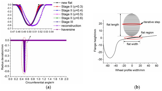 Firstly, the most common methods—wheel center trajectory description and radius deviation description—only describe the geometry of the wheel in the longitudinal direction and do not account for the width of the wheel flat. The authors of [17] found that for a fixed flat length, a wider flat increases the wheel–rail vertical impact, and a wide flat results in a jump at the wheel–rail contact point compared with a narrower flat.