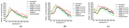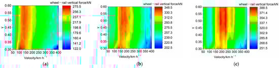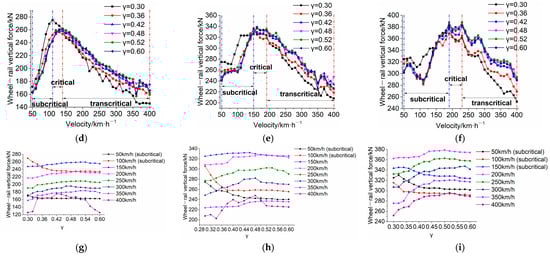 Based on this pattern, the variation in the wheel–rail vertical force with the worn coefficient in the subcritical and transcritical regimes is further examined, as shown in Figure 12g–i. In the subcritical regime, the wheel–rail vertical force gradually decreases as the worn coefficient increases, while in the transcritical regime, the wheel–rail vertical force initially increases and then decreases with increasing worn coefficient.