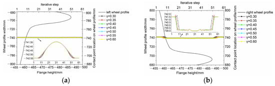 The change in the coordinates of wheel–rail contact points in each iterative step with different worn coefficients. (a) Left wheel. (b) Right wheel.