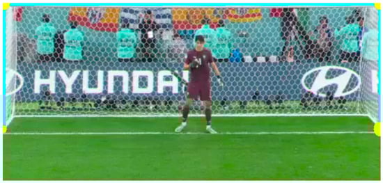 The color of each pixel in the collected footage was in RGB format, which identifies the red, green, and blue values for each pixel. We chose the RGB values (100, 150, 50) and (220, 220, 220) to represent the grass and goalpost colors, respectively [26]. The RGB format presents problems in isolating colors because the time of day and weather can influence the perceived color of a given object. To account for this, we converted each frame to CIELUV color space to ensure that the perceived color of objects remained consistent across varying lighting conditions, thereby enhancing the accuracy of color-based object identification [27]. We subtracted the green from the frame and isolated the goalposts. The frame was then blurred and OpenCV’s contour function was used to identify large shapes within the frame. We assumed that the largest contour represents the goal area and used that assumption to create a bounding box, as shown in Figure 1. We then used a Hough line transformation to identify all lines within the bounding box. These lines were then filtered into horizontal and vertical lists based on their angles [26]. The endpoints of these lines were then clustered, and the centroid of the identified cluster was used to create raw values for the goal corners.