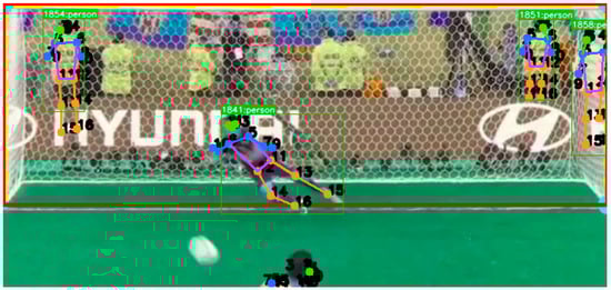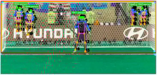 After creating the isolated goal area videos, we applied the YOLOv7 pose estimation algorithm to each video [29]. We chose YOLOv7 because it is open-source, general-purpose, and does not have licensing restrictions. Pose estimation must be applied at the frame level. YOLOv7 identifies all possible people in a given image, but identity across images is not recorded. Therefore, we applied a SORT object tracking algorithm to track the bounding box of the goalkeeper across frames. The SORT tracker allowed us to assign an integer ID label to all detected persons in each frame and isolate the pose data of interest. Examples of the pose estimation person labels are shown in Figure 6 and Figure 7. YOLOv7′s pose estimation model provides the estimated locations of 17 keypoints (joints), listed in Table 1, as well as confidence scores for the bounding box of the human and all keypoints [30]. The confidence score is the probability that a given person or joint in the image has been correctly identified. This probability is provided on a 0–1 scale, with a higher score implying higher certainty of identification. By averaging the confidence scores for each joint over a set of frames, we can interpret the stability of the pose estimation algorithm in that set.