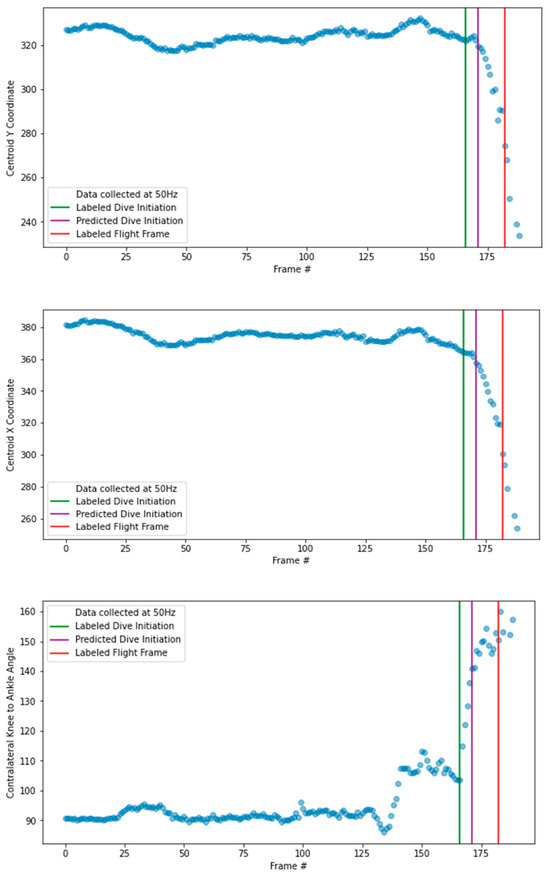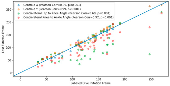 The initial regression (Table 3) showed that the last extrema for the centroid x component, centroid y component, and contralateral knee-to-ankle (lower leg) angle were the most significant predictors of goalkeeper movement initiation. Figure 8 shows the correlation between each of these variables and the labeled dive frame. Of these two, the centroid y component was more significant. Because the centroid is agnostic to the dive direction and goalkeeper strategy, we chose to create a parsimonious model using the centroid y component. The parsimonious model results indicated that the centroid y (β = −0.96, p < 0.001) component accounts for 99.8% of the variance in the labeled initiation of movement. Figure 9 provides a comparison of predicted and labeled dive initiation for a selected video.