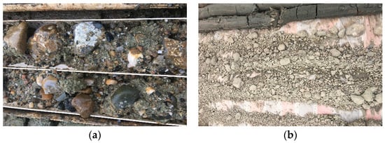Representative core samples of ⑤-1 and ⑤-2 layers: (a) Core samples of pebble gravel. (b) Core samples of gravelly sand.