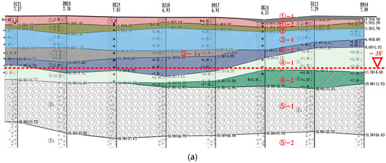 Table 1 shows the physical and mechanical parameters of strata in the construction site. It was found that the ①-1 and ①-2 layers have loose structure, low strength, medium−high compressibility, and belong to weakly permeable strata. The ②, ③-1, and ③-2 layers are in a soft−flowing plastic state and have low strength, medium−high compressibility, and belong to slightly−weakly permeable strata. The ④-1 and ④-2 layers are in hard−soft plastic state and have medium compressibility, and they belong to slightly permeable strata. The ⑤-1 and ⑤-2 layers have medium~low compressibility and high permeability. The ⑥-1 and ⑤-2 layers have high strength and slight permeability, which are good bearing and waterproof layers.