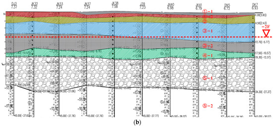 Typical geological profiles of construction site: (a) Geological profile of underground 3-floor basement. (b) Geological profile of underground 2-floor basement.