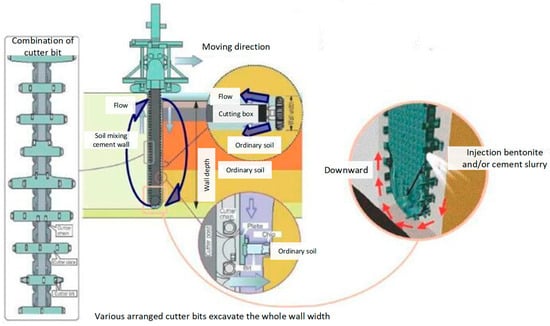 TRD technology, also known as the Trench cutting Remixing Deep wall method, is a new construction technology for waterproof curtains that has been widely used in recent years [30,31,32]. It uses a chain saw cutter to cut the soil horizontally and then injects cement slurry to mix with the in situ soil to form a continuous cement–soil wall with equal thickness, as shown in Figure 5. The waterproof curtain wall built using TRD technology can reach a depth of 60 m, the verticality is not more than 1/250, and the wall has good homogeneity and reliable waterproof performance. It has a good adaptability in soft clay, dense sand with an SPT blow count of 50–60, gravel with a diameter less than 100 mm, and soft rock with an unconfined compressive strength not more than 5 MPa [33,34].
