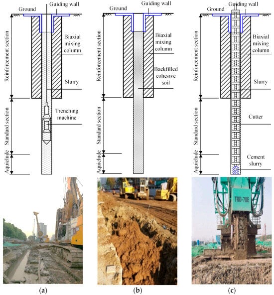 - Li, X.; Xie, Z.L.; Li, J.J.; Di, G.E. TRD method and its applications in the deep excavation engineering. Chin. J. Undergr. Space Eng. 2011, 7, 945–950. [Google Scholar] [CrossRef]