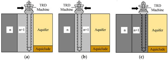 Construction process of trenching-and-replacing-style TRD technology: (a) Step 1. (b) Step 2. (c) Step 3.
