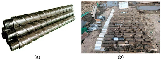 To evaluate the quality of the waterproof curtain constructed by the trenching-and-replacing-style TRD technology, the core samples were obtained by drilling for lab tests. Considering that a conventional single-tube drilling tool cannot obtain the complete core samples from the pebble gravel layer, and the borehole below a certain depth may deviate from the wall with low verticality, it was optimized to a single-driving double-tube drilling tool for coring, as shown in Figure 8a. The single-driving double-tube drilling tool has an inner tube and an outer tube, and the drill pipe only drives the outer tube to rotate, but the inner tube does not rotate, which can avoid the mechanical breakage of the core sample caused by rotation-induced friction vibration, thus improving the coring quality.