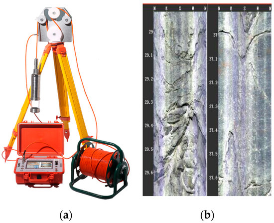 After core drilling was completed, the borehole television imaging detection method was adopted to convert the 360° borehole image into a 2D plane image and fed back to the ground terminal in real time. The main components of borehole television imaging equipment include a high-definition camera, signal collector, depth measuring device, transmission cable, image analyzer, etc., as shown in Figure 9a.