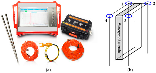 Due to the limitations of geological conditions and construction workmanship, the waterproof curtain inevitably has some quality defects, such as leakage, cavities, and cracks [17,18]. Therefore, there is a need to detect the construction quality of the waterproof curtain before excavation. At present, the commonly used nondestructive detection technologies for waterproof curtain defects include thermal [19,20,21,22,23], sonic [24,25,26], electromagnetic [27,28,29] methods, etc. However, each detection method has its technical applicability and emphasis. As the waterproof curtain faces complex geological and environmental conditions, if only one detection method is adopted, the detection results may not reflect the real situation objectively, so it is necessary to adopt multiple detection methods for comprehensive evaluation.