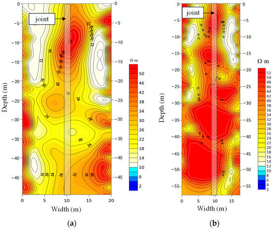 Detection results of waterproof curtain by resistivity CT: (a) Waterproof curtain in 2-floor basement. (b) Waterproof curtain in 3-floor basement.