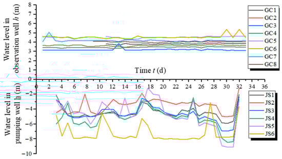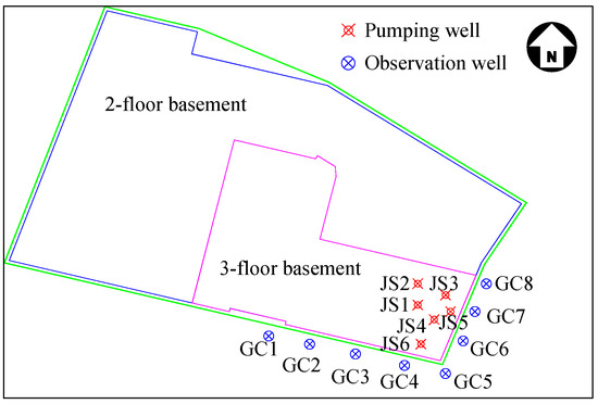 Using the above detection technologies, the quality of the waterproof curtain in a local position or region was evaluated. To evaluate the overall service performance of the waterproof curtain, a group well pumping test was carried out in the southeast corner of the foundation pit corresponding to the area of the underground 3-floor basement. As shown in Figure 12, seven pumping wells (JS 1~JS 7) with wellhead elevations of 5 m in the pit and eight observation wells (GC 1~GC 8) with wellhead elevations of 7 m outside the pit were set. During the pumping process, the water level change in the observation well was observed synchronously.