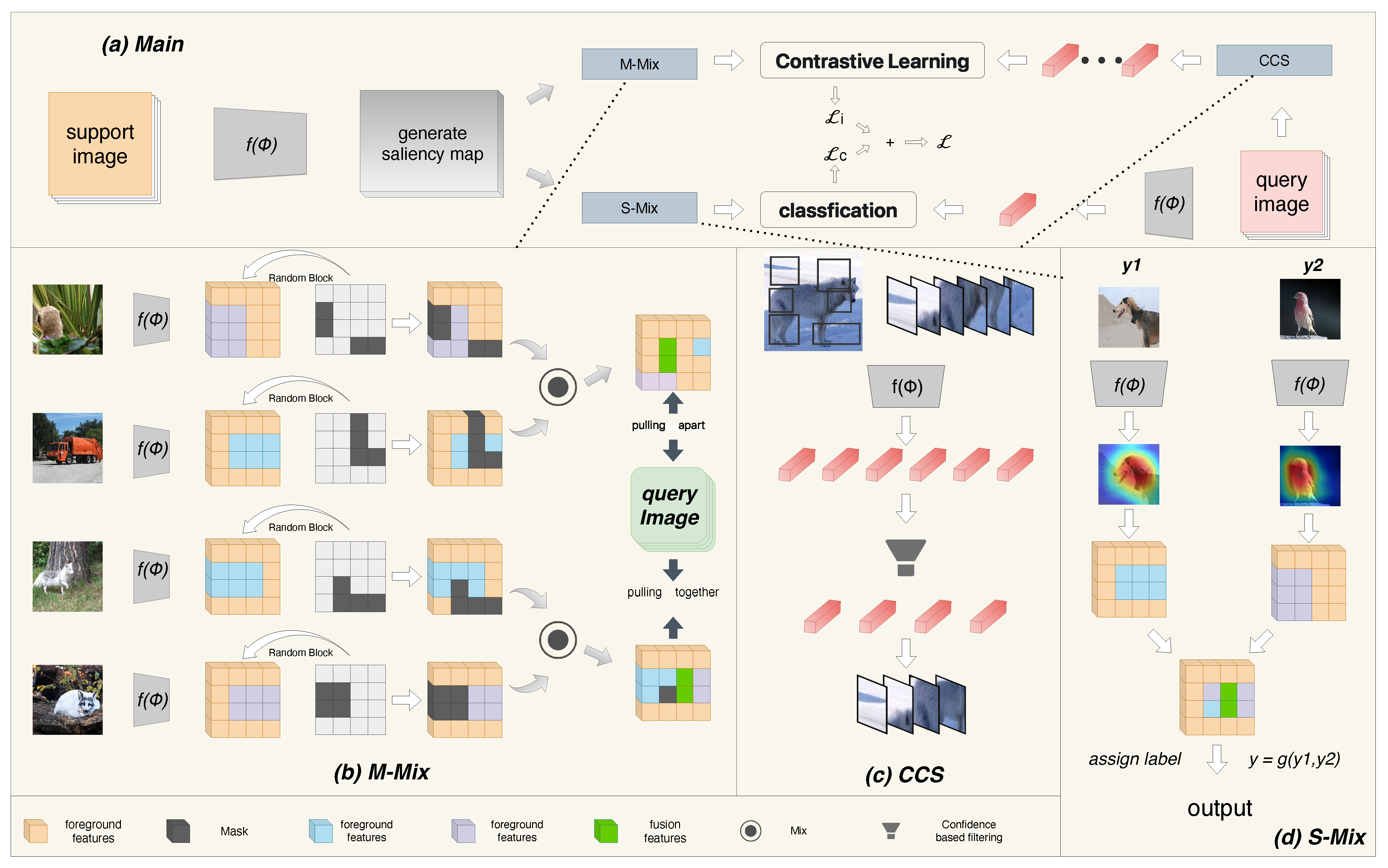 Figure 2a), which comprises three key modules. The first module is M-Mix, which optimizes the infoNCE loss to suit few-shot learning, leveraging augmentation techniques to unearth challenging samples. The second component is a module named CCS, utilizing a confidence-based method to select desired query samples. The third module, SF, eliminates the masking process from the M-Mix method, primarily aimed at introducing noise for better embedding in the model.
