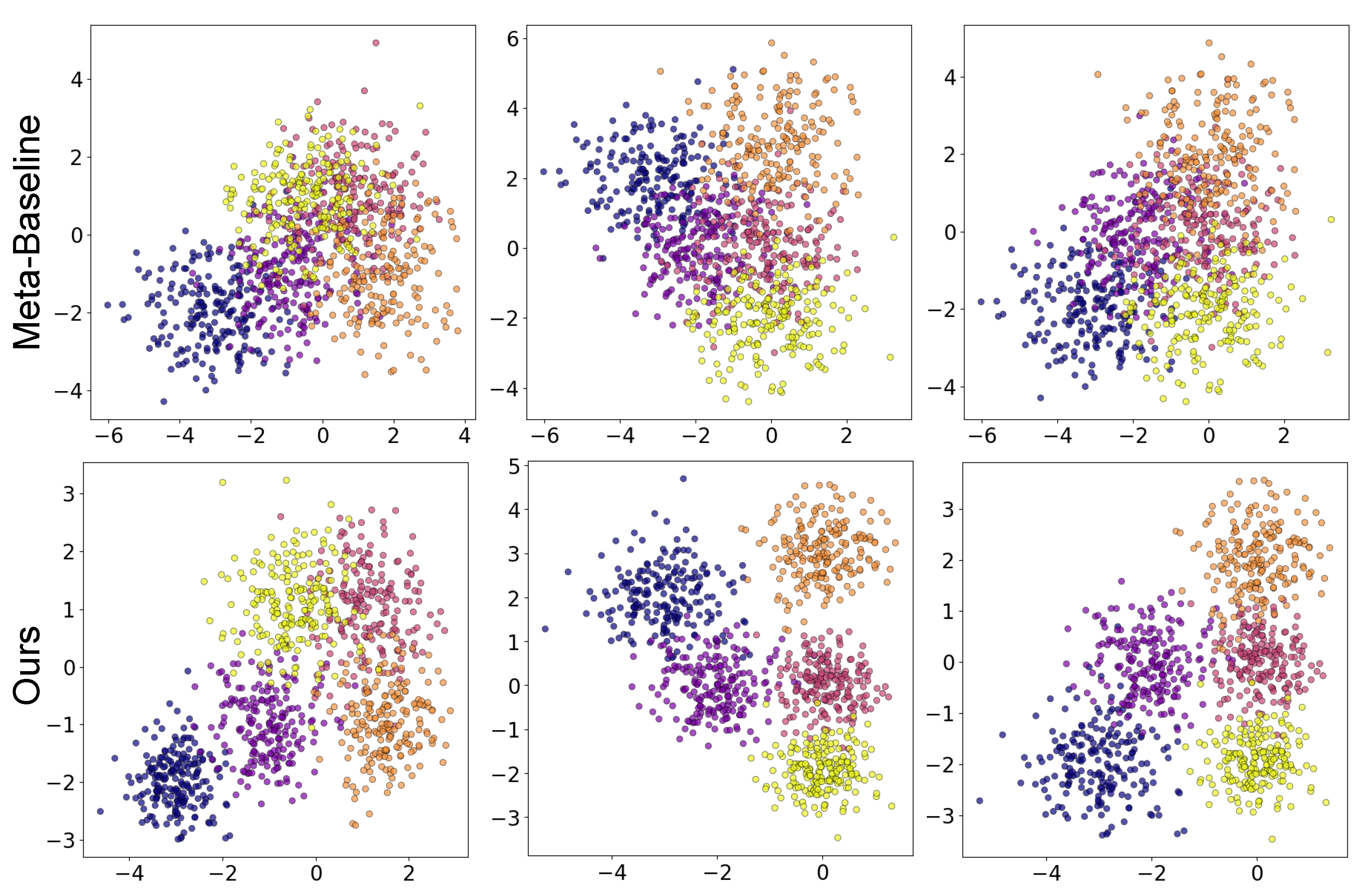 Figure 4 presents the visualizations of the embeddings. From the figure, it is apparent that the images generated by the baseline model lack compactness, with many categories blending together, whereas our method produces images that are more compact, allowing the images of each category to cluster more effectively.
