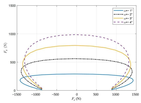 These parameters are inserted into Equations (1) and (2) by MATLAB, and, given the slip ratio, sideslip angle, roll angle, vertical force and road friction coefficient, the longitudinal and lateral force can be obtained. The influence of longitudinal force on the lateral force can be demonstrated by friction ellipse, as shown in Figure 1.