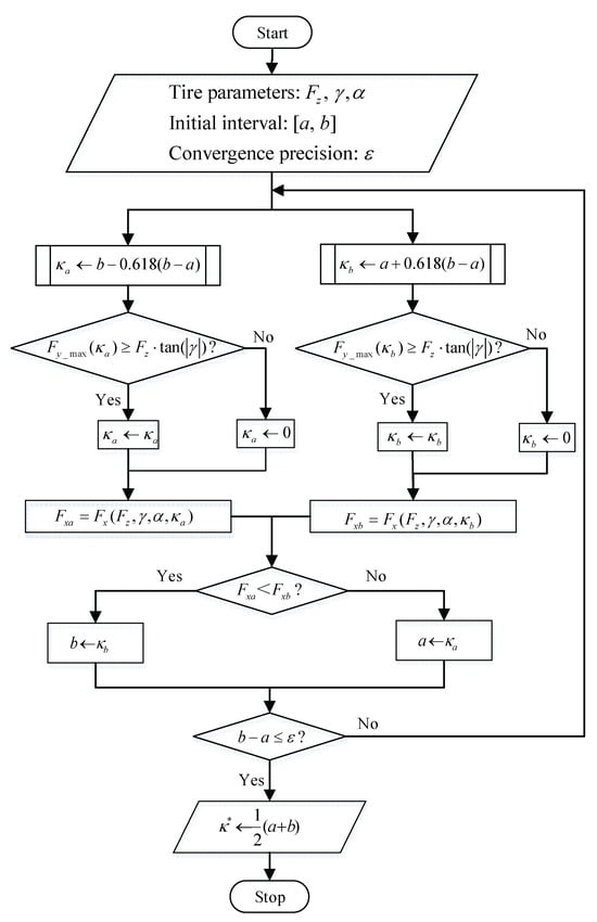 The longitudinal characteristics in [19] show that the longitudinal force exhibits a unimodal distribution across a slip ratio range from −1 to 0. The golden section search method is adeptly employed to tackle the optimization problem. The calculation flow chart is shown in Figure 2. First, the relevant motion parameters are specified, such as the vertical force and sideslip angle. Define initial interval and convergence accuracy ε. Insert two points and in the initial interval, and the initial range [a, b] is divided into three sections: , and . The maximum lateral force corresponding to the insertion point is calculated, respectively, and compared with the centrifugal force to determine whether the vehicle stability constraints are met. If the insertion point satisfies the stability constraint, the insertion point is reserved and assigned to the variable κ, otherwise κ is set to 0. The longitudinal forces and at the insertion point are calculated and compared.