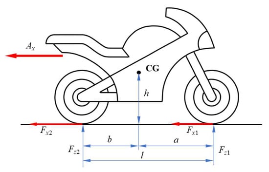 According to Equation (4), under braking conditions, the vertical force of the front wheel increases and the rear wheel decreases. In practical application, the braking deceleration can be measured by Inertial Measurement Unit (IMU), and the vertical force can be obtained by plugging the body parameters into Equation (4).