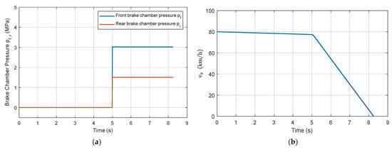The simulated environment is set as follows: the motorcycle travels for 5 s at the initial speed of 80 km/h, during which neither drive nor brake is applied; the vehicle is affected by air resistance or tire rolling resistance, and the speed decreases on a small scale. At the beginning of the 5th second, 3 MPa pressure is applied to the front wheel brake cylinder, and 1.5 MPa pressure is applied to the rear wheel brake cylinder. The speed drops sharply to zero. Front and rear wheel brake cylinder pressure and motorcycle speed change curves are shown in Figure 6.