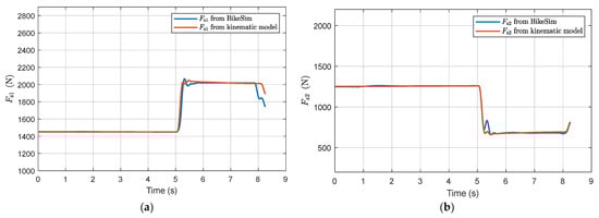 In the process of vehicle braking, due to the influence of inertial force, the vertical load of the front and rear wheels will change, which will further affect the longitudinal and lateral characteristics of tires. Therefore, the simulated vehicle data are substituted into Equation (4) to obtain the vertical load of the front and rear wheels. Then, the measured vertical force from BikeSim was plotted as a change curve over time and compared with the calculated value. The simulation results are shown in Figure 7. The vertical force from kinematic analysis is consistent with the simulation results of BikeSim, which verifies the rationality of the kinematic model.