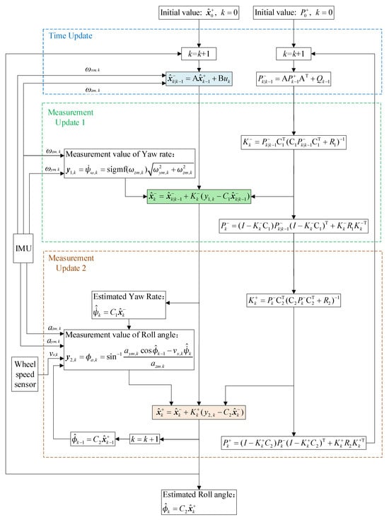 The roll angle estimation process is shown in Figure 9. There are three stages: a time update, a first measurement update and a second measurement update.