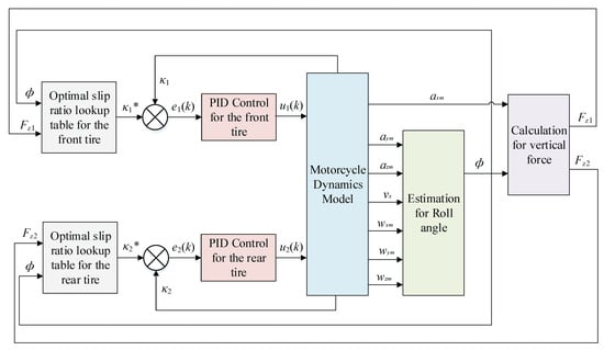Baumann et al. [7] employed a model predictive control algorithm (MPCA) to optimally distribute power to the front and rear wheels, effectively reducing steering torque during cornering. This approach is designed to preserve directional stability, ensuring a more controlled and predictable ride. Harshal Rameshwar More et al. [8] designed an anti-lock braking system for motorcycles that uses linear PID control. The electronic control unit calculates the slip ratio using the wheel speed and the vehicle speed. The slip ratio feeds back to the PID controller, which then adjusts the braking torque to control the tire slip ratio to a reference slip rate of −0.2.