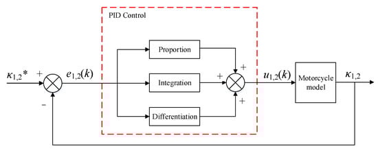 The optimal slip ratio and the current slip ratio constitute a deviation e1,2(k). Proportional, integral and differential operations are carried out on the deviation value. The sum of the calculation results u(k) is used as the braking torque to adjust the tire slip ratio, as shown in Equation (19).