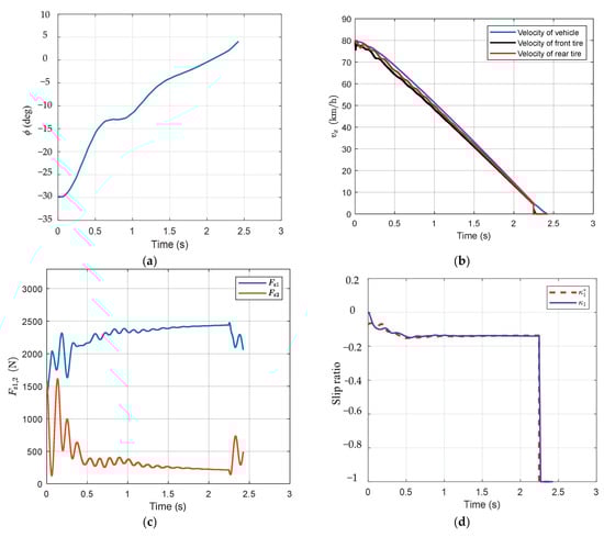 The vertical load on the front and rear wheels (Figure 14c) also changes because there is load transfer during braking, and the simulation results are consistent with the analysis results in Section 2. The load of the front wheel increases significantly and is close to 2500 N, while the load of the rear wheel decreases and is below 500 N. From the brake control perspective, the larger the vertical load, the larger the applied braking torque, and the larger the proportional coefficient. Table 5 and Table 6 verify this point; the proportional coefficient of the front wheel controller is greater than the rear wheel. According to the optimal slip ratio optimization in Section 2, under the same roll angle, the larger the vertical load, the smaller the optimal slip ratio. Therefore, compared with the rear wheel, the front wheel should adopt a smaller optimal slip ratio .