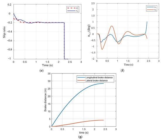 The change curve of front and rear wheel sideslip angle is shown in Figure 14f. The sideslip angle is between −2° and 2°, so the proposed braking system ensures good directional stability.