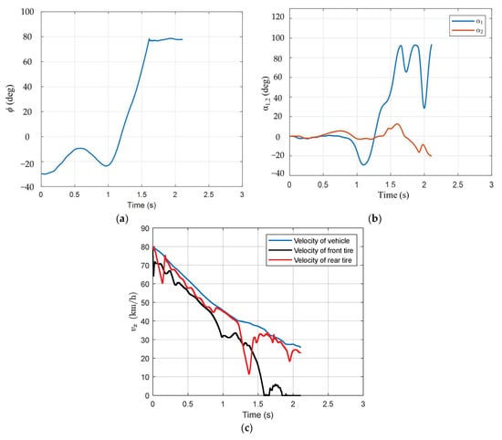 Simulation of braking system using a fixed slip ratio. (a) Roll angle; (b) sideslip angle; (c) velocity.