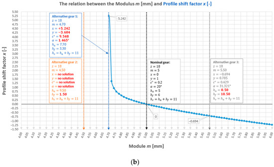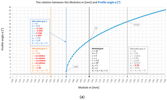 It is clearly visible from Figure 3a that, for module 4.70 (i.e., ), a wheel geometry is achieved, which is impossible from the design point of view (for example, due to the negative whole depth factor ). This variant is close to the left asymptote of the graph, for which . However, on the right side, where the graph has no limits on the argument domain, theoretically, the value of the module can be increased indefinitely. However, this graph is not coupled with the limit value of the shift factor at which tooth undercutting occurs at the base. The graph presented in Figure 3b is an alternative version of the graph in Figure 3a, with the parameter on the vertical axis changed from the profile angle to the profile shift factor. The same conclusions can be drawn from it, but it additionally shows the shape of the function of the presented relationship. In the future, it is planned to create three-dimensional design maps to enable more effective recognition of the relationships between all three parameters: , , and .