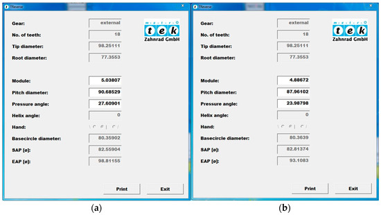 Two alternative sets of geometric parameters for Gear No. 2 Mark 13 during measurement on Wenzel WGT 600 using the TReverse module: (a) recreated module ; (b) recreated module (photos taken from the WGT 600 operating system interface during measurements for the next article, where this will be discussed in more detail).