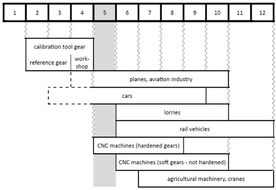 Figure 5 shows a diagram for selecting the gear accuracy class of the produced gear depending on the industry and the application area. It is expected that each of the wheels tested is made in grades 5 to 10.