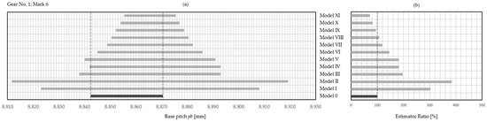 The most effective estimator turned out to be the one presented in Model X, using the symmetric Student–Fisher distribution, which turned out to estimate the nominal tolerance zone by 100 or close to 100 (at least in one case of gear 53) percent. This allowed for: (i) in two cases, maintaining the original IT grade of the tested wheel; (ii) leaving the IT grade the same or increasing it by one step in the case of two gears; (iii) increasing the IT grade by one step for only three gears; and (iv) increasing the IT grade of just one gear by two steps. Of course, we are only talking about the estimator ratio expressed in [%]. However, in the future, the possibility of restoring the nominal IT grade should be taken into account, as should the method of “straightening” the graph of the estimated tolerance zone in relation to the nominal tolerance zone, as significant shifts in the graphs could be noticed in the tests.