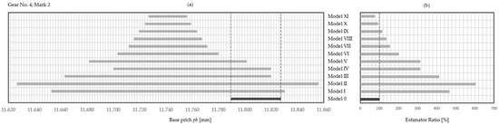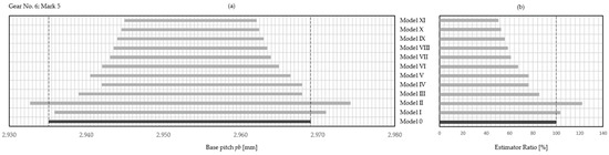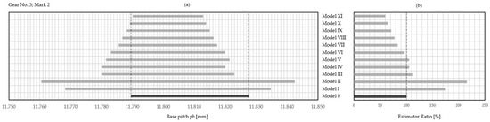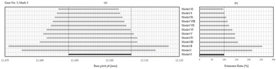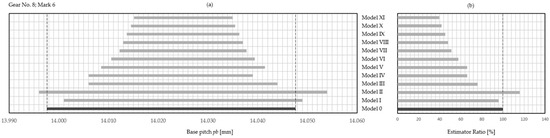One important issue still remains, namely, what IT grade to choose for the reproduced gear. Although the research results generate a general view as to which estimator best approximates the nominal tolerance zone of the base pitch, it is still unknown within which IT grade this is achieved. The most effective estimator (Model X with S-F distribution and confidence level ) was chosen, and this issue was subjected to a preliminary analysis. Table 10 presents the analysis report. These results do not take into account the analysis of the IT grade of the tested wheel. For now, the authors are only preliminary checking what the applied estimator would cause in the context of the nominal IT grade.