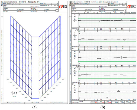 Two graphs for the Gear No. 2 Mark 13 during measurement on Wenzel WGT 600: (a) topography of the tooth surface, (b) pitch error and pitch deviations (photos taken from the WGT 600 operating system interface during measurements for the next article, where this will be discussed in more detail).