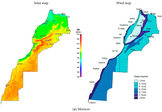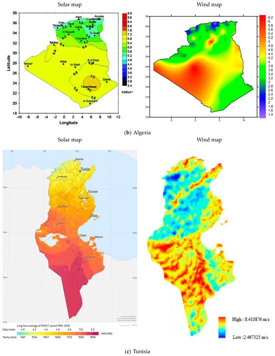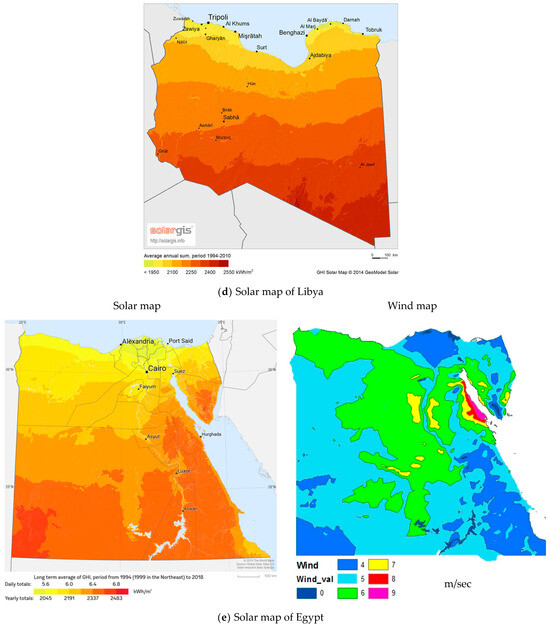 Solar and wind map of North African countries, (a) Morocco [5], (b) Tunisia [6,7], (c) Algeria [8], (d) Libya [9], (e) Egypt [10,11].