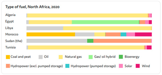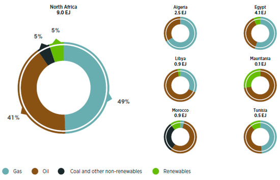 While efforts are being made to expedite the energy transition in North Africa, the continent’s main energy sources remain dependent on natural gas, coal, and oil. In 2019, 95% of the world’s primary energy supply was derived from fossil fuels, as mentioned in Figure 4. Oil dominates the economies of Algeria, Egypt, Libya, Morocco, and Tunisia, making up around 45% to 85% of all of North Africa’s final consumption [17]. The two largest producers of natural gas in Africa are Algeria and Egypt, which helps to explain why these two countries are so reliant on non-natural resources. Gas and oil make about 40% of all Egyptian product exports [18] and provide 95% of Algeria’s hard currency earnings [19]. Regarding proven crude oil reserves, Libya owns the highest amount in Africa.