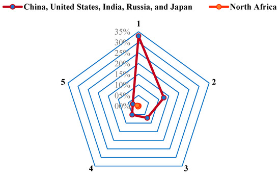 Even though North African nations rely heavily on fossil fuels, their carbon dioxide (CO2) emissions are still very low when measured against developed nations. In 2021, North African countries accounted for just 1.59% of global carbon dioxide (CO2) emissions, while China, the US, India, Russia, and Japan accounted for 60.48%. As mentioned in Figure 5 and Figure 6.